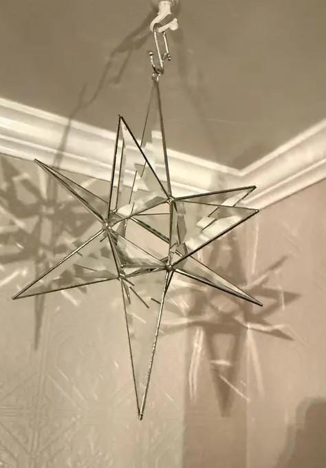 This beautiful 12 Point star is handcrafted in the Tiffany copper foil method. The star measures 11 1/2" x 7" and is crafted with clear bevel glass. Each star is hand polished and inspected for quality prior to leaving our studio. This star makes a beautiful gift for that special person all year round.