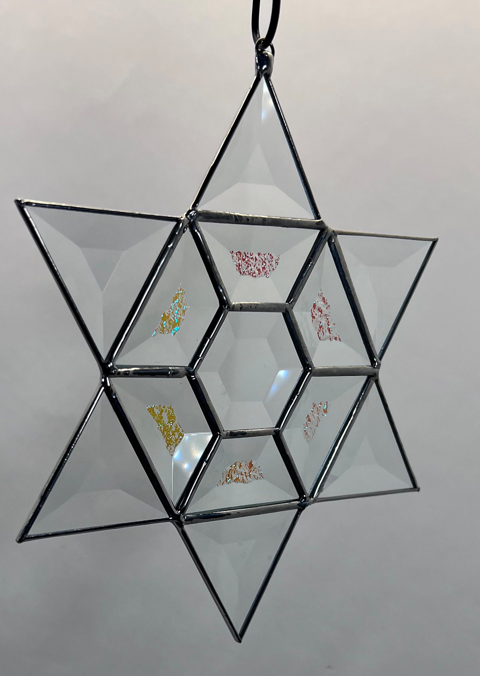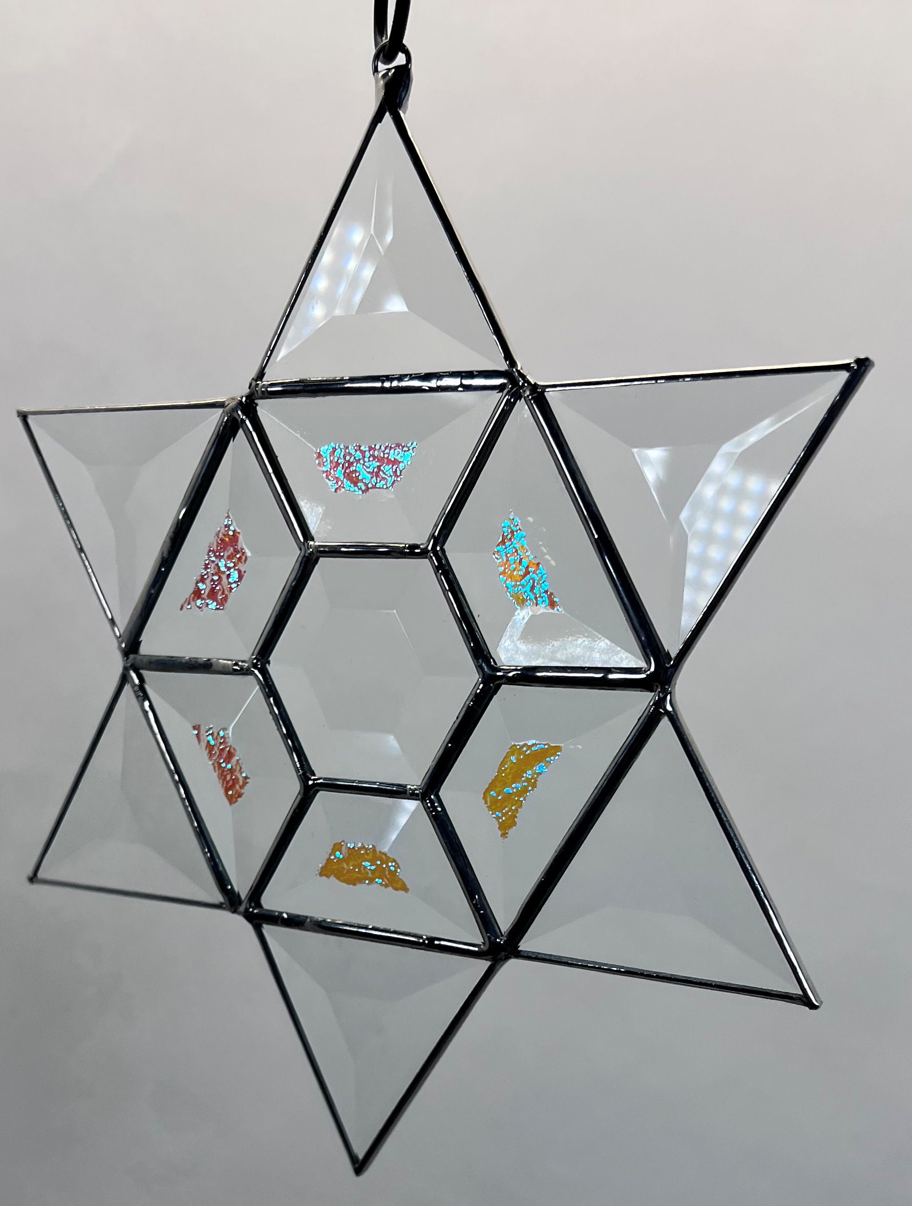 This beautiful bevel Star of David is handcrafted in our stained glass studio formerly located in Bethlehem, Pennsylvania.