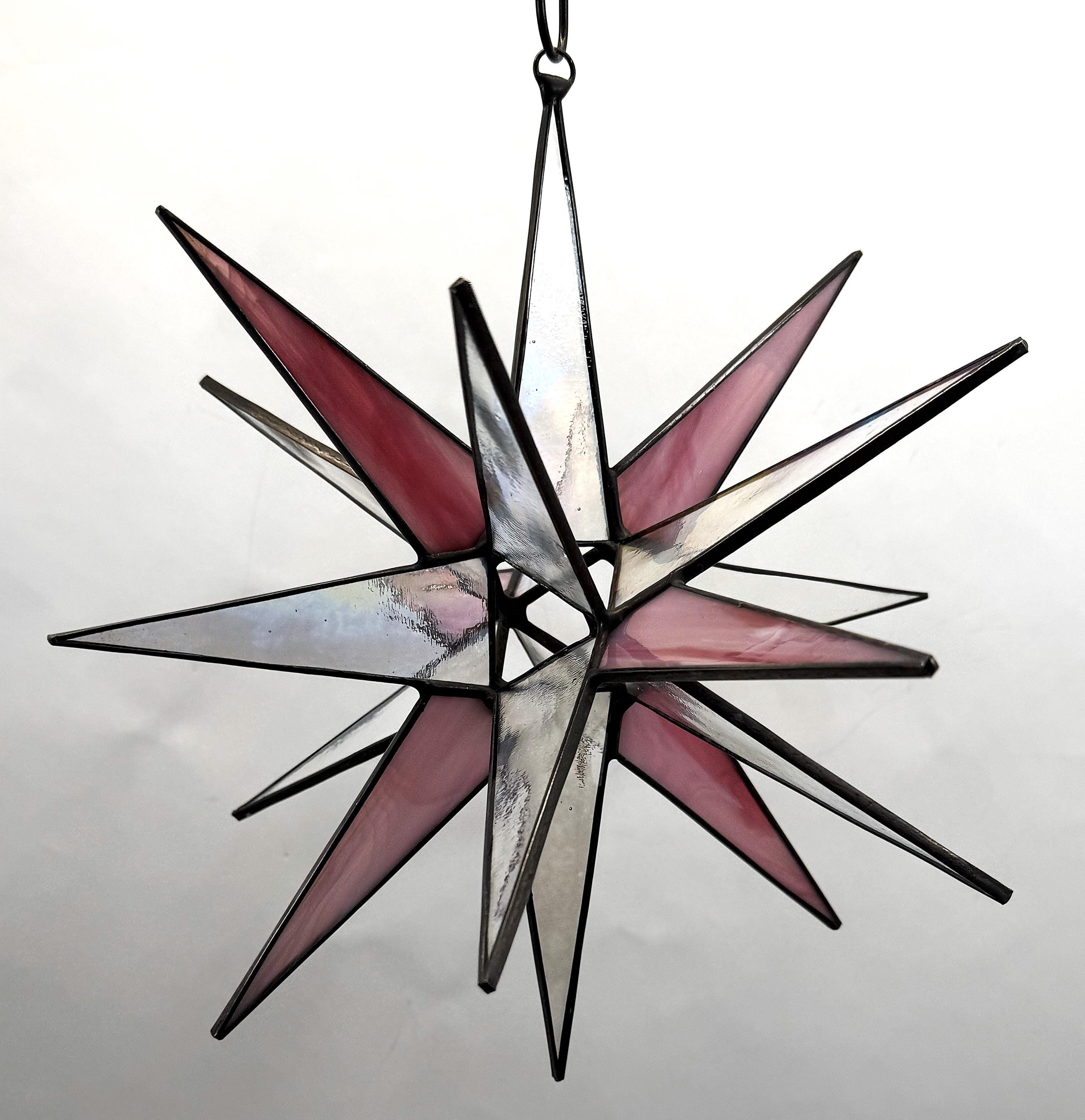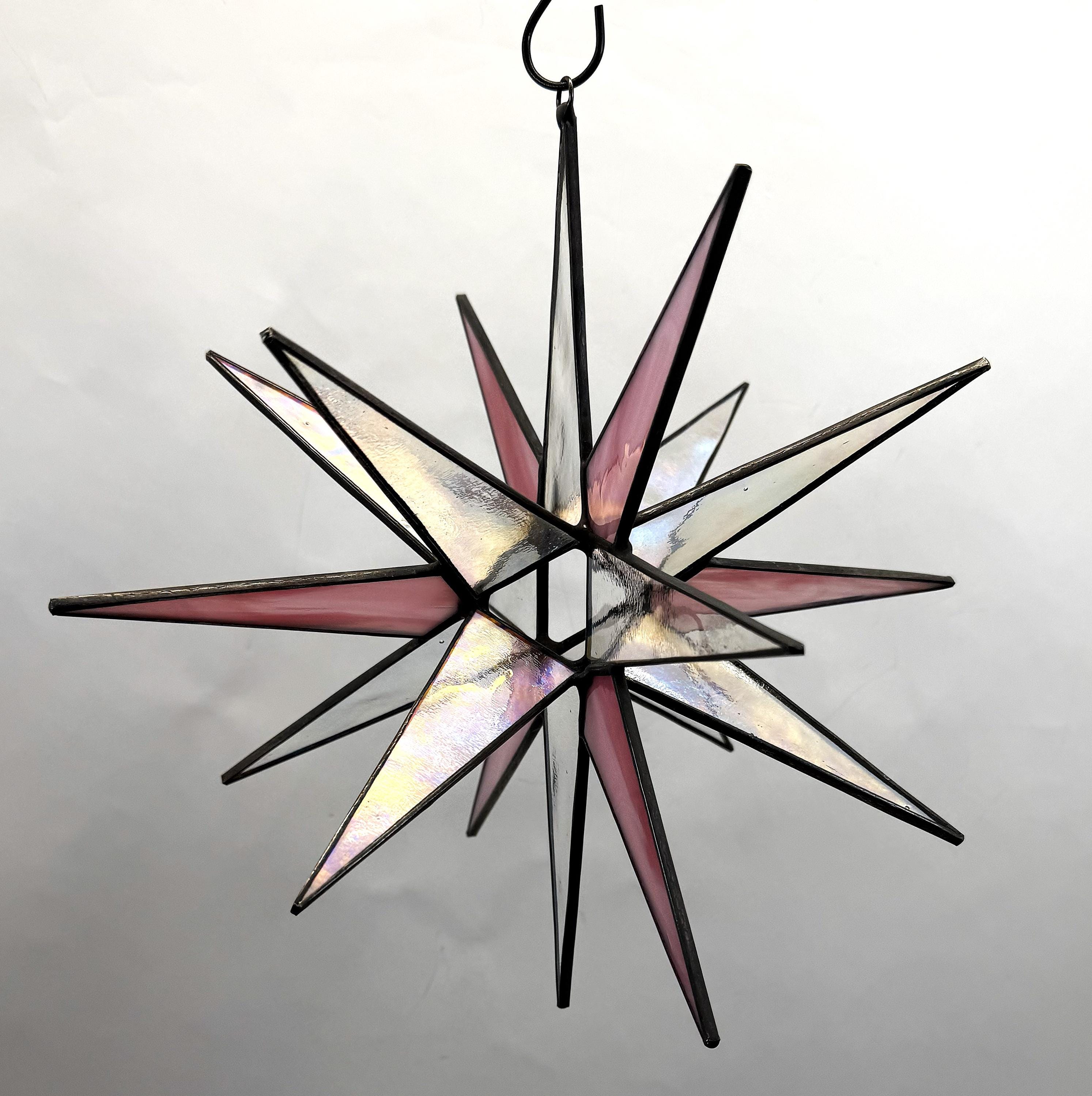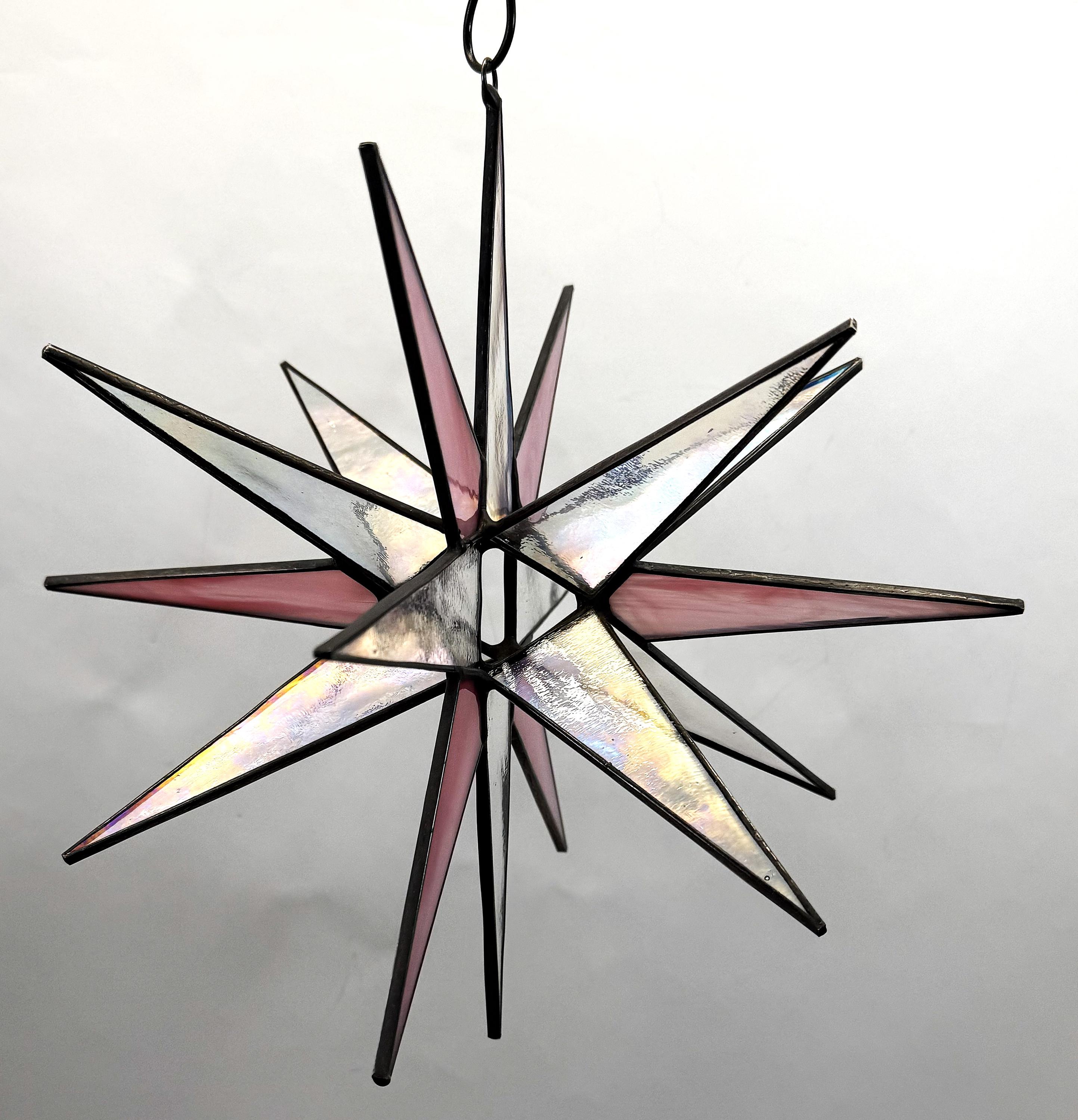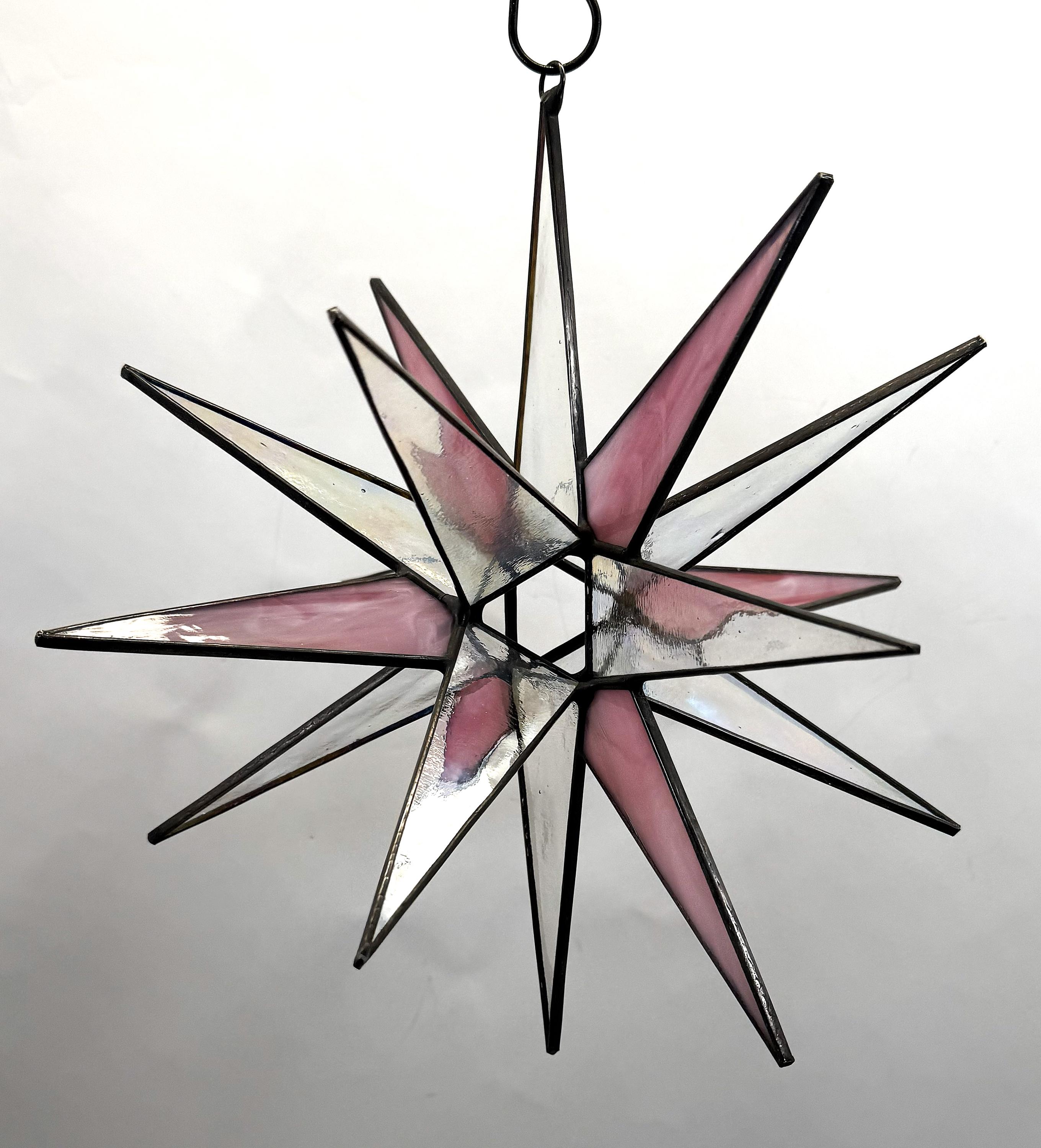 This beautiful 18 Point star is handcrafted in the Tiffany copper foil method. The star measures 10" in diameter and is crafted with clear iridescent translucent glass and pink whispy glass.