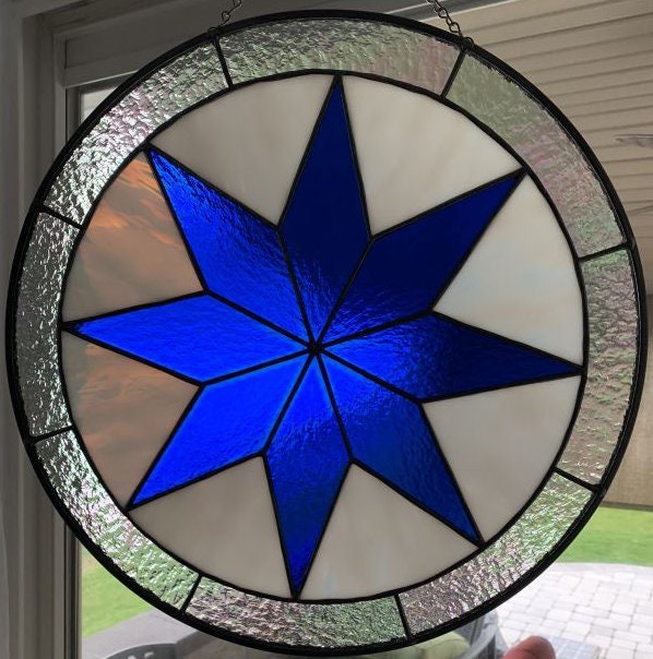 This beautiful hand crafted panel measures 19" in diameter. It features a cobalt blue textured glass Moravian star in the center. I also added beautiful iridescent glass as a border for the piece. The white glass is also textured. The iridescent glass just sparkles. When hanging in a window and the sun is shining through, the glass is absolutely beautiful.