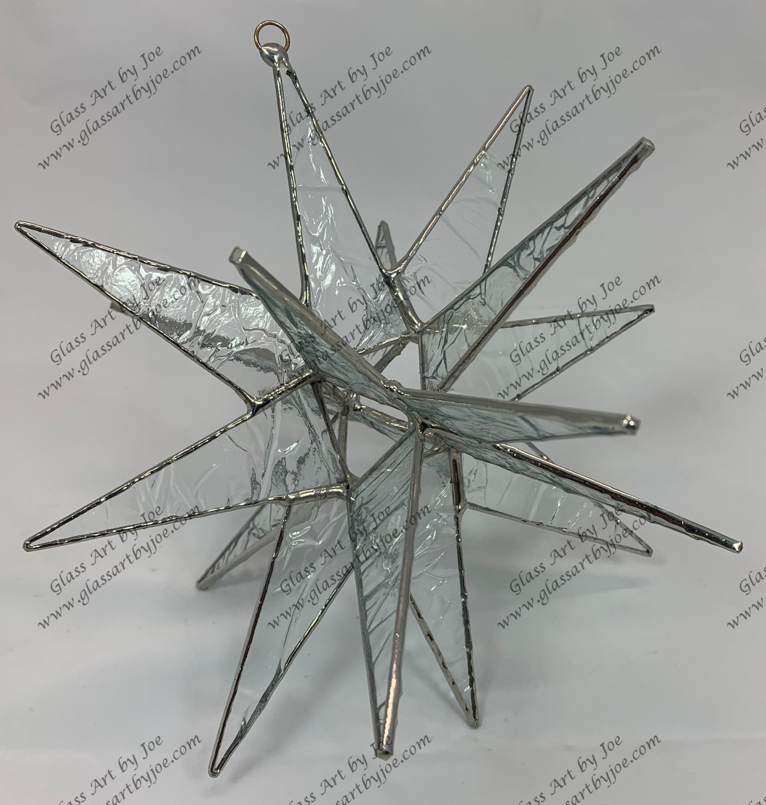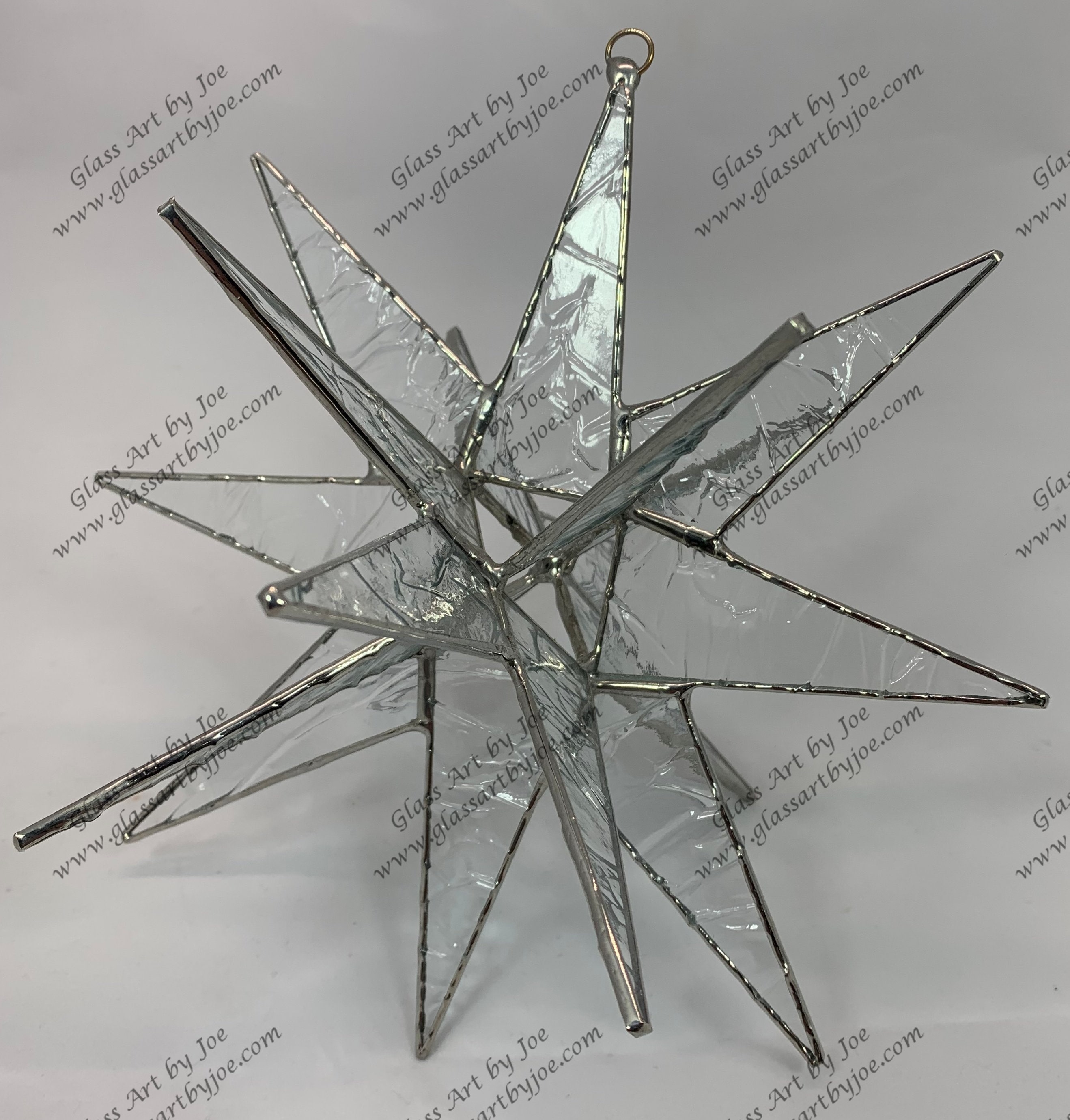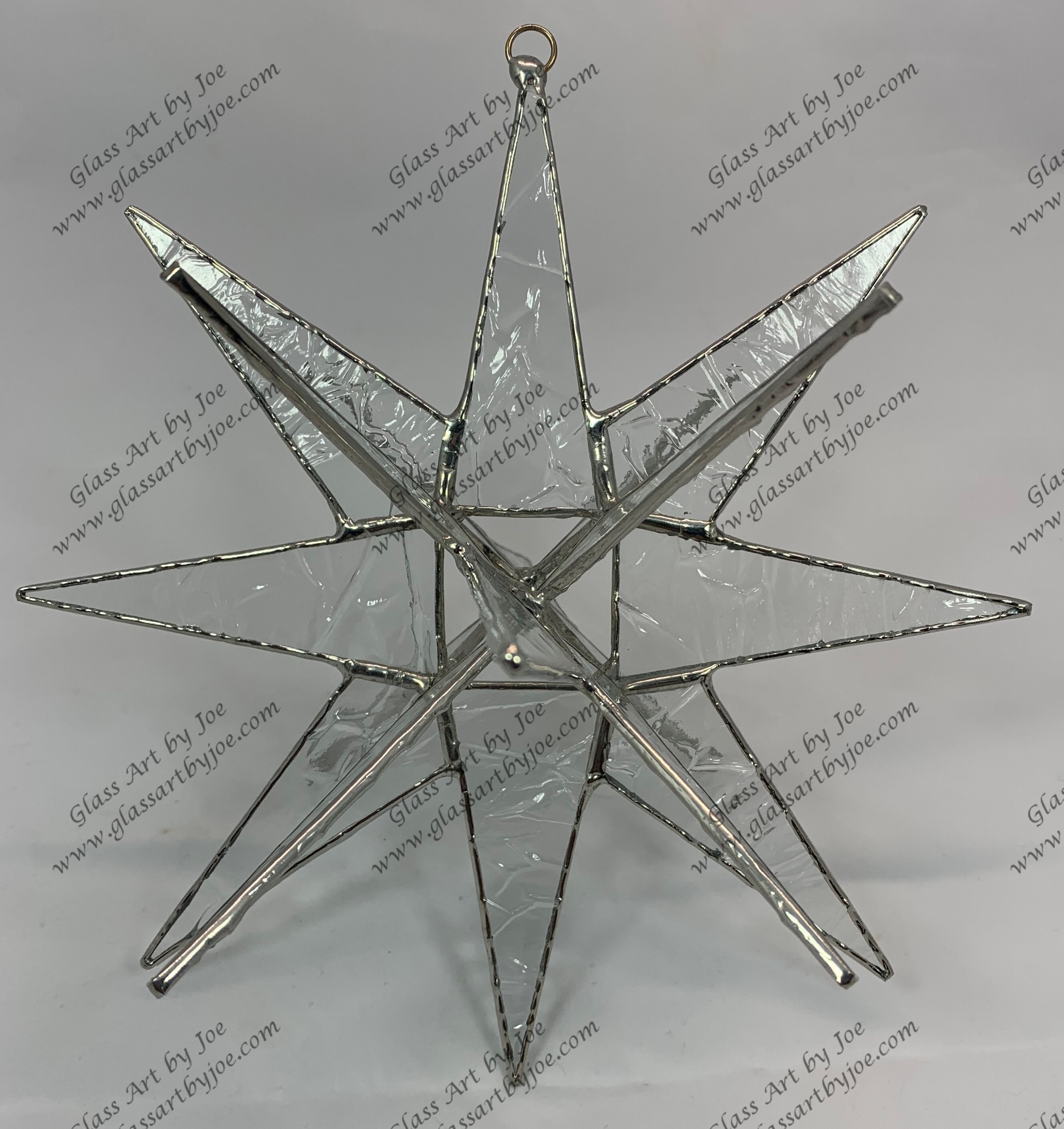 This beautiful 18 Point star is handcrafted in the Tiffany copper foil method. The star measures approximately 8 1/4" in diameter and is crafted with clear crinkle glass. Each star is hand polished and inspected for quality prior to leaving our studio. This star makes a beautiful gift for that special person all year round.